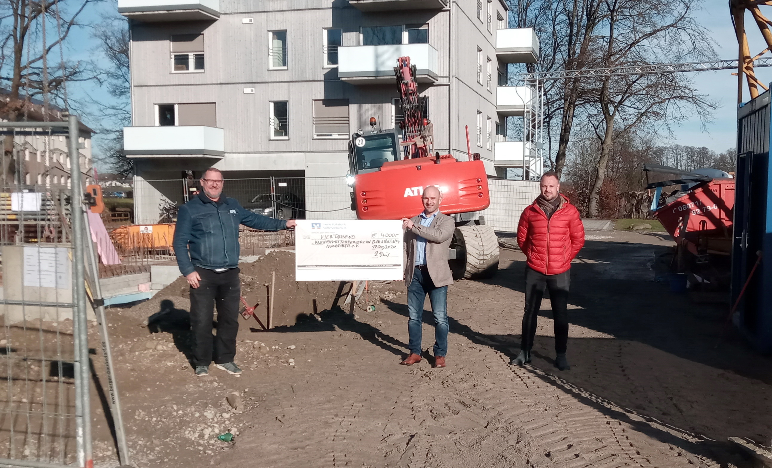 Die Scheckübergabe fand im B&O-Parkgelände in Bad Aibling, auf der Baustelle des Neubaus des Ingenieurbüros Weisser, statt. Der Firmeninhaber überreichte Präsident Benjamin Hauer einen Scheck, den dieser freudig entgegennahm.