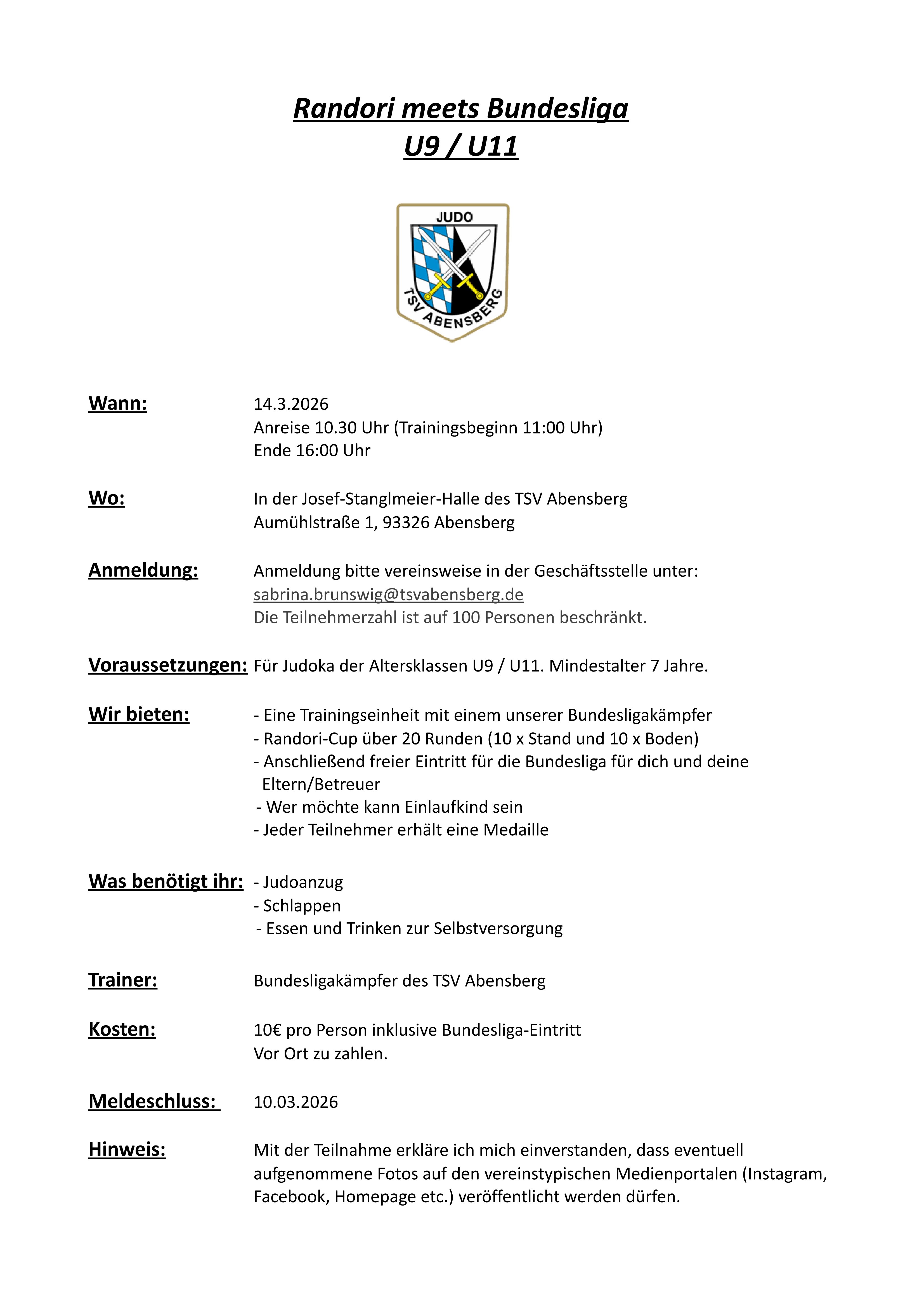 Zum Beginn der neuen Bundesligasaison richtet der TSV Abensberg am 14. März einen Tageslehrgang für die Altersklassen U9/U11 aus.