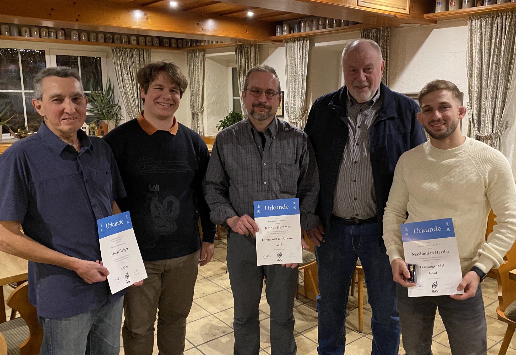 Mit der Verleihung des goldenen Leistungsabzeichens war sodann das sportliche Aushängeschild des Judoclub Naisa, Maximilian Heyder, an der Reihe. Er wurde bereits 2012 und 2013 aufgrund seiner Erfolge im Jugendbereich, wo er zweimal Deutscher Meister geworden war, mit den Leistungsabzeichen in Bronze und Silber geehrt. Zwischenzeitlich hat er dreimal in Folge (2019, 2020 und 2021) den Titel des Deutschen Meisters errungen, was -so Ehrenpräsident Fleißner- seines Wissens zuvor in Bayern nur einem Athleten, nämlich dem ehemaligen BJV-Präsidenten Raphael Boezio gelungen sei. Zudem erkämpfte er sich im Jahr 2019 eine Bronzemedaille bei den European Open in Tallinn. Last but not least durfte sich Vorstandsmitglied und Trainer Horst Geiger über die Verleihung des 3. Dan freuen. Horst Geiger engagiert sich seit über 20 Jahren in vielfältigster Weise für den Judosport sowohl als Funktionär, als auch als Trainer und Kyu-Prüfer. Er legte im Juli 2016 erfolgreich die Prüfung zum 2. Dan ab und begann in der Folgezeit mit dem Training für den 3. Dan, konnte diesen jedoch aus gesundheitlichen Gründen bis heute nicht ablegen. Trotz seiner gesundheitlichen Beeinträchtigungen engagiert er sich nach wie vor als Vorstand und Trainer, lässt sich nicht entmutigen und blickt mit großem Kampfgeist nach vorne. Mit dem 3. Dan wurde vom BJV deshalb sein großes Kämpferherz und sein überaus vorbildhaftes Wirken für den Judosport gewürdigt.